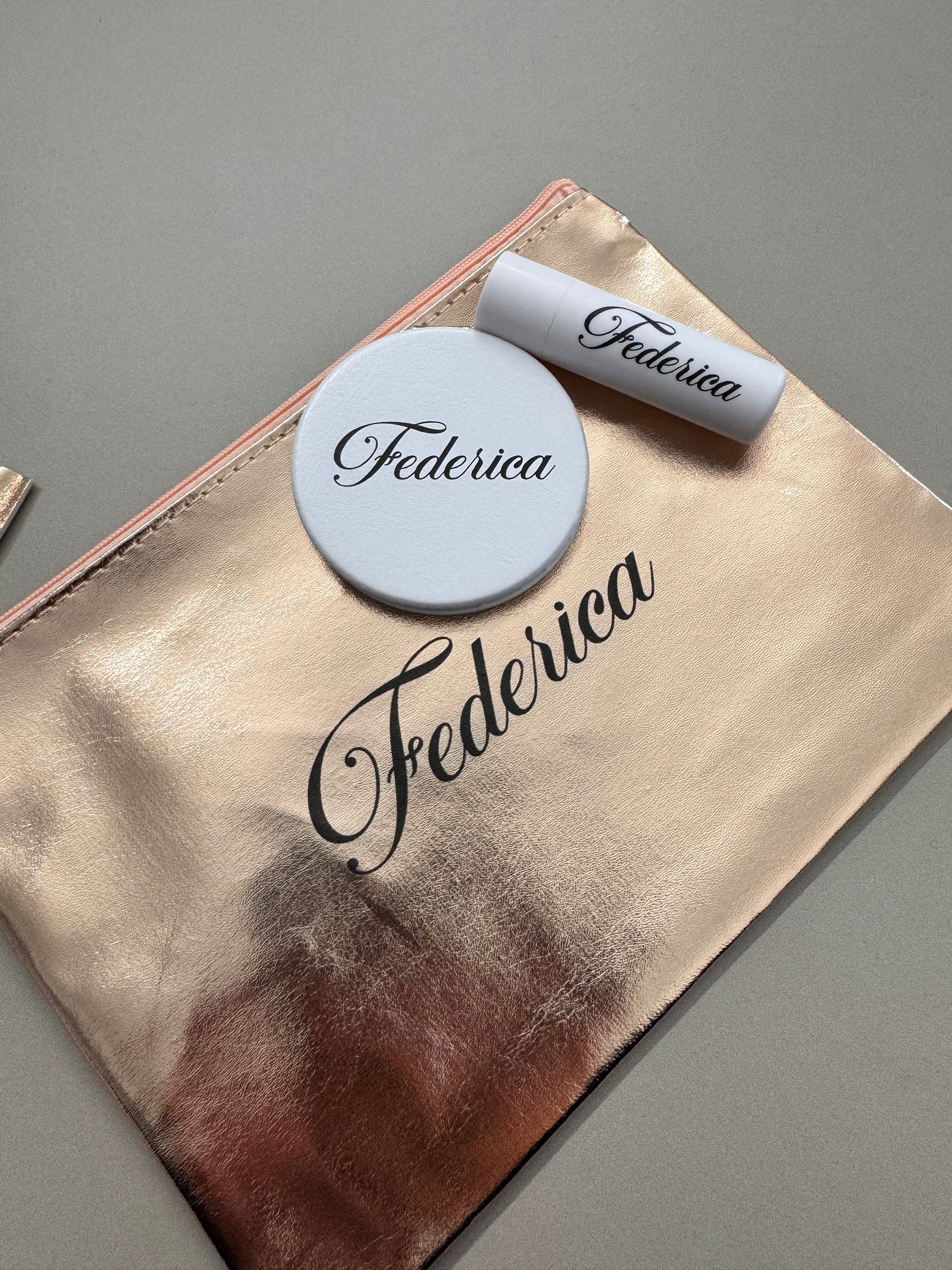 Set pochette, specchietto e Labello personalizzati.